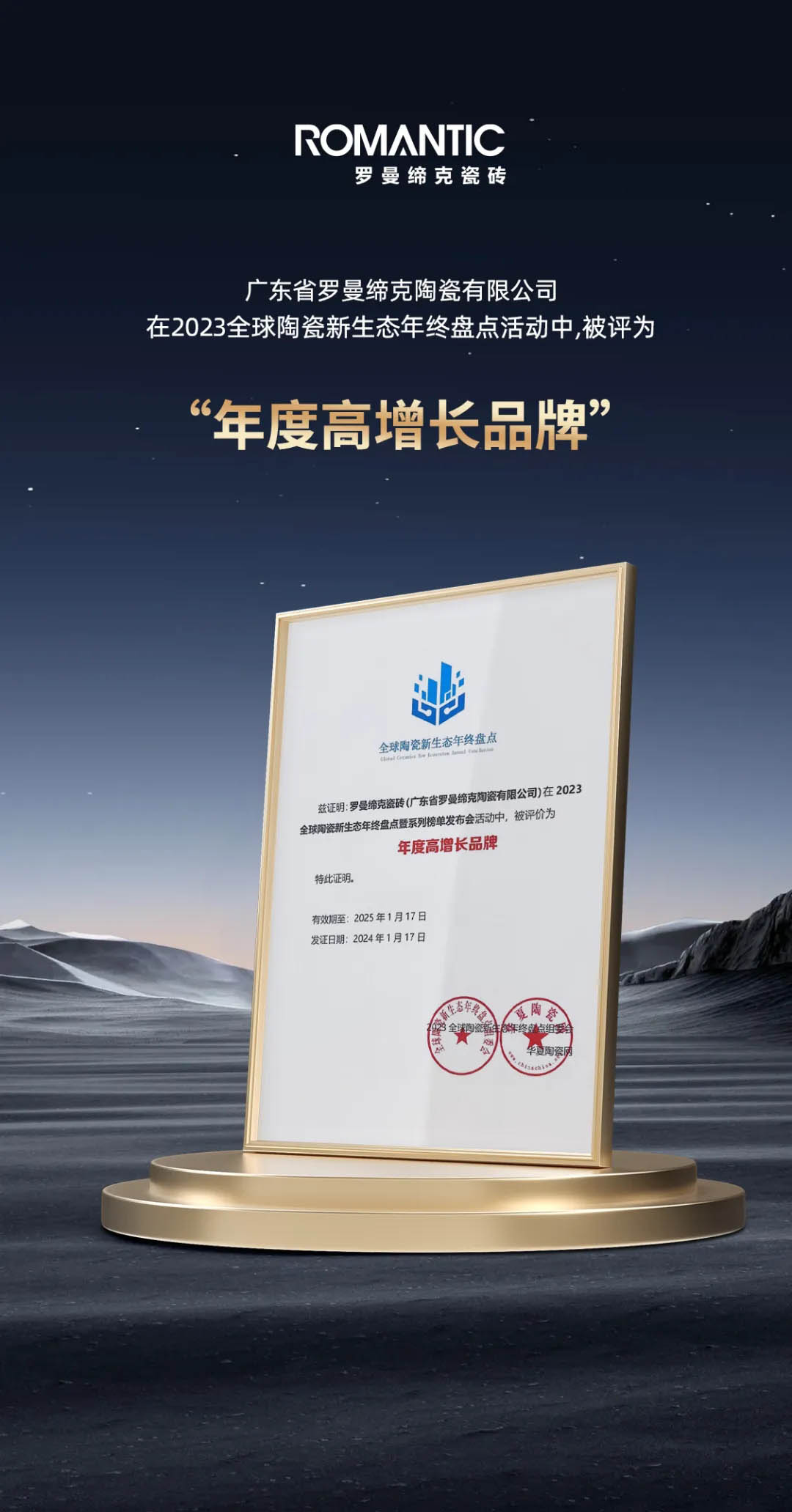 1月17日,增長的秘密——2023全球陶瓷新生態(tài)年終盤點暨設(shè)計驅(qū)動產(chǎn)品供應鏈論壇在中國陶瓷總部劇場隆重召開?,F(xiàn)場舉行系列榜單發(fā)布暨頒獎禮,羅曼締克瓷磚憑借卓越的品牌實力、創(chuàng)新的產(chǎn)品與技術(shù),榮獲“2023全球建筑衛(wèi)生陶瓷品牌TOP100”及“2023年度高增長品牌”雙項榮譽。
